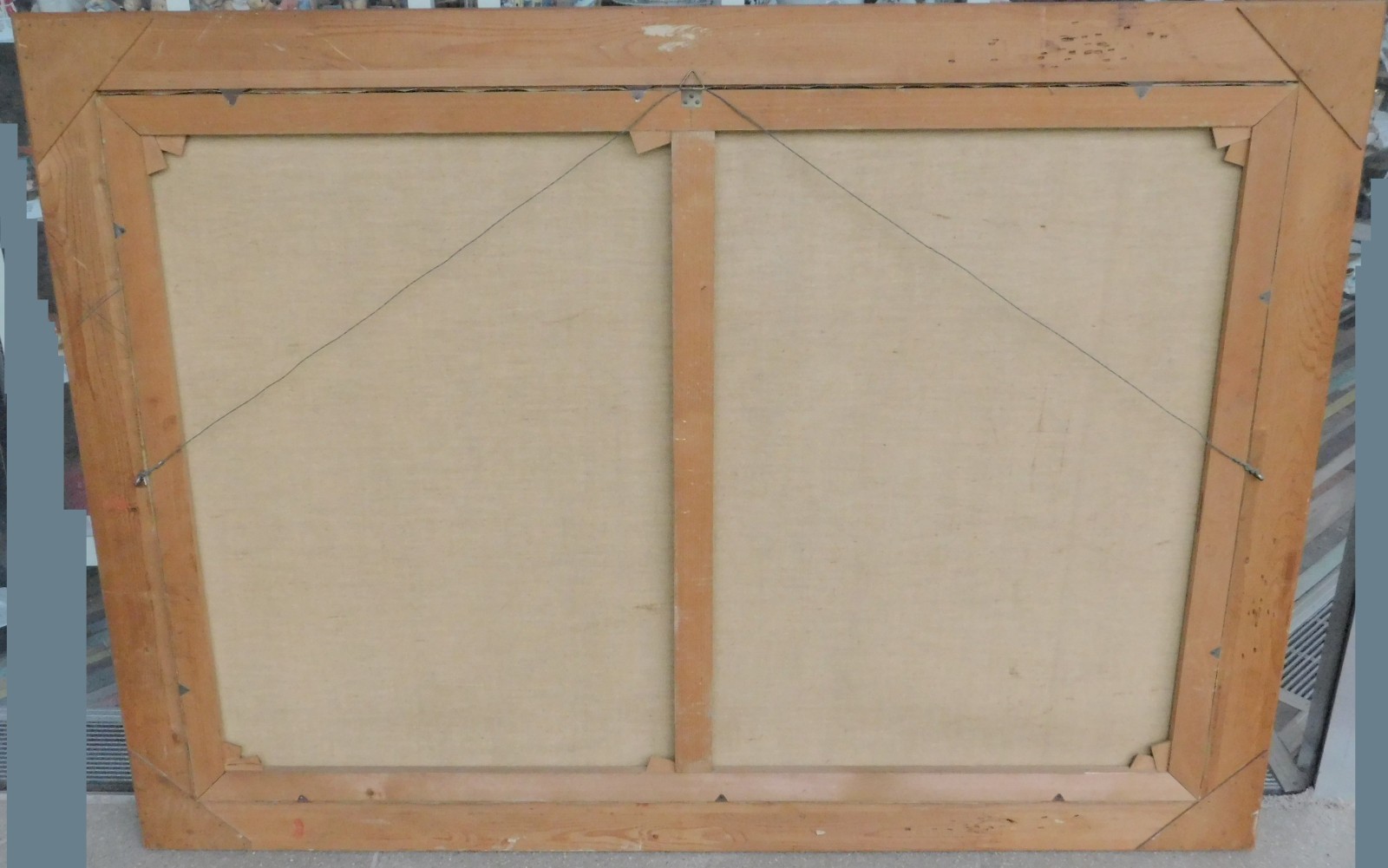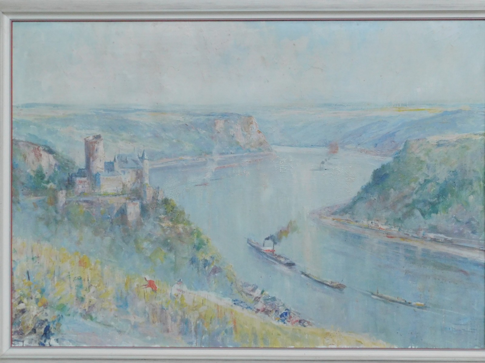 Monumentales altes Ölgemälde Burg Katz am Rhein von dem bekannten Maler Willi (Wilhelm) Holtmann (1908 Duisburg - 1984 Wiesbaden), signiert s. Foto, Burg Katz mit Loreley, Dampfschiffe / Lastkähne auf dem Rhein, vorne Winzer bei der Arbeit im Weinberg, Öl auf Leinwand auf Keilrahmen in altem Holzrahmen, Bild bis auf leichte Gebrauchsspuren guter Zustand, Farbe stellenweise leicht craqueliert, kleine Reinigung / Restaurierung zu empfehlen - dann wieder ein wunderschönes Bild, Rahmen mit Gebrauchsspuren – als kostenlose Beigabe, Außenmaße ca. 147,5 x 108 cm, Bild ca. 130,5 x 90,5 cm.