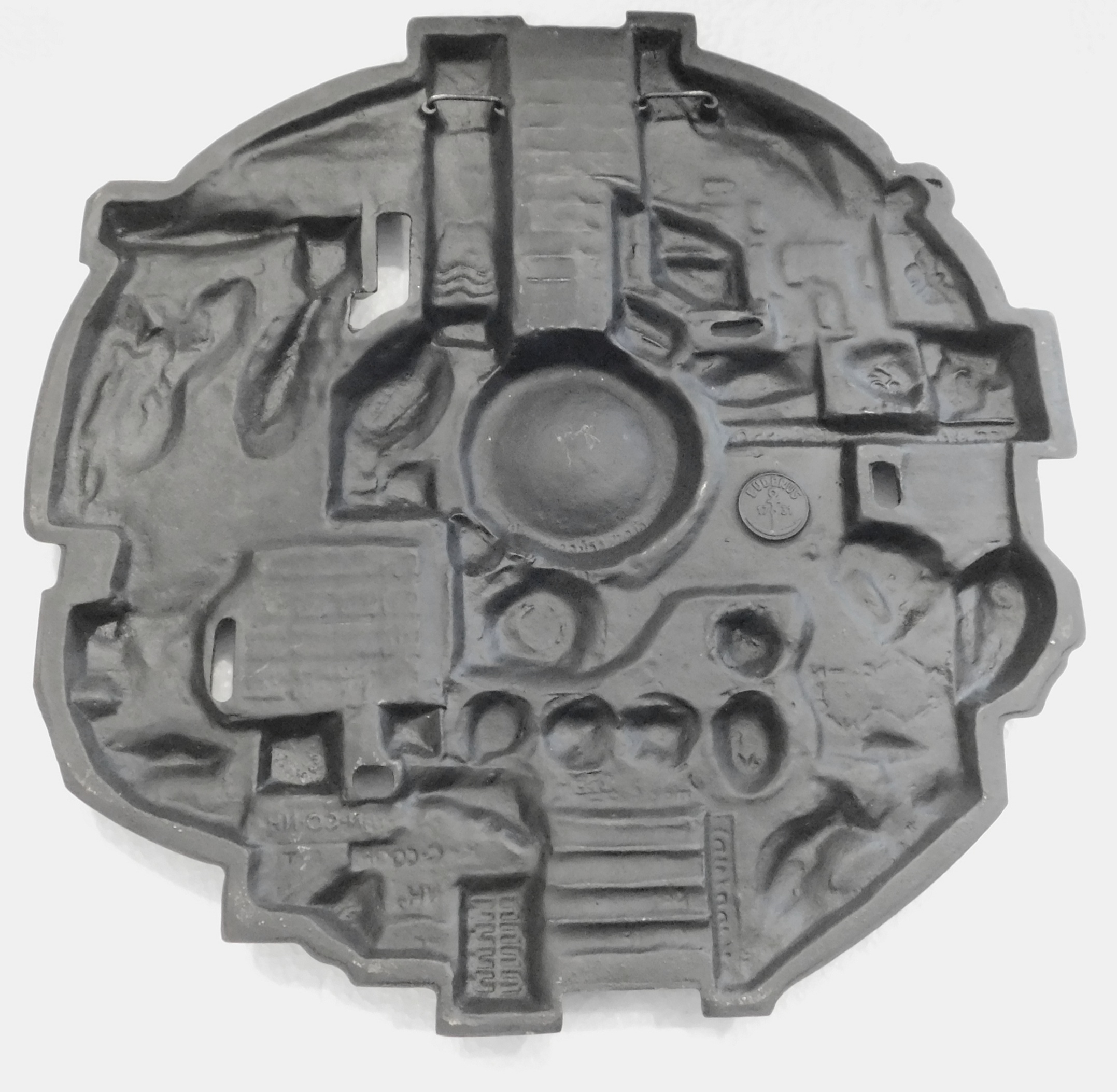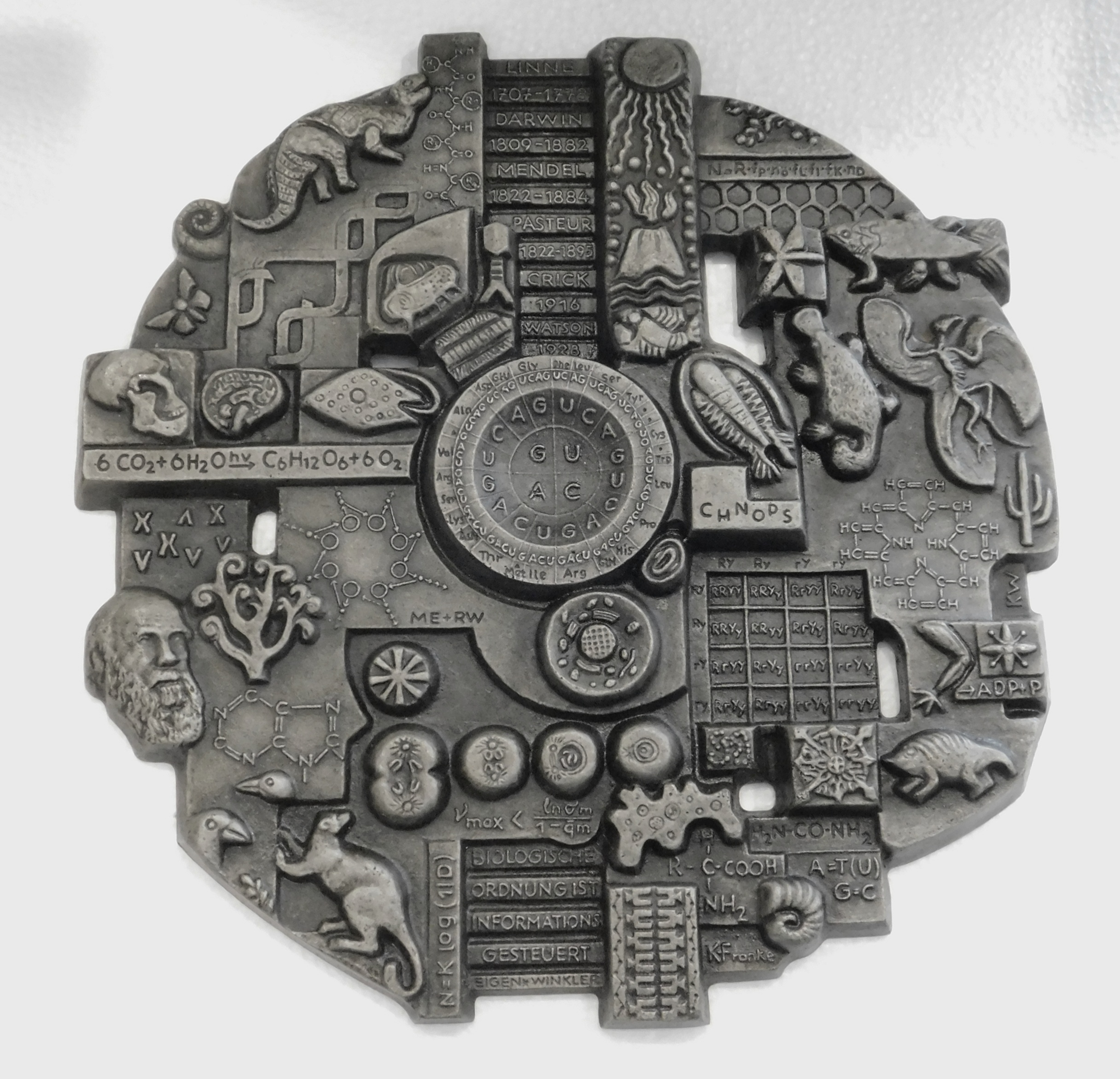 Buderus Eisenguss Relief Biologie aus der Serie Naturwissenschaft und Technik, Entwurf Karl Franke, stark reliefiert ausgeformt, ca. 34 x 33,5 cm, Gewicht ca. 4176 Gramm, guter Zustand.