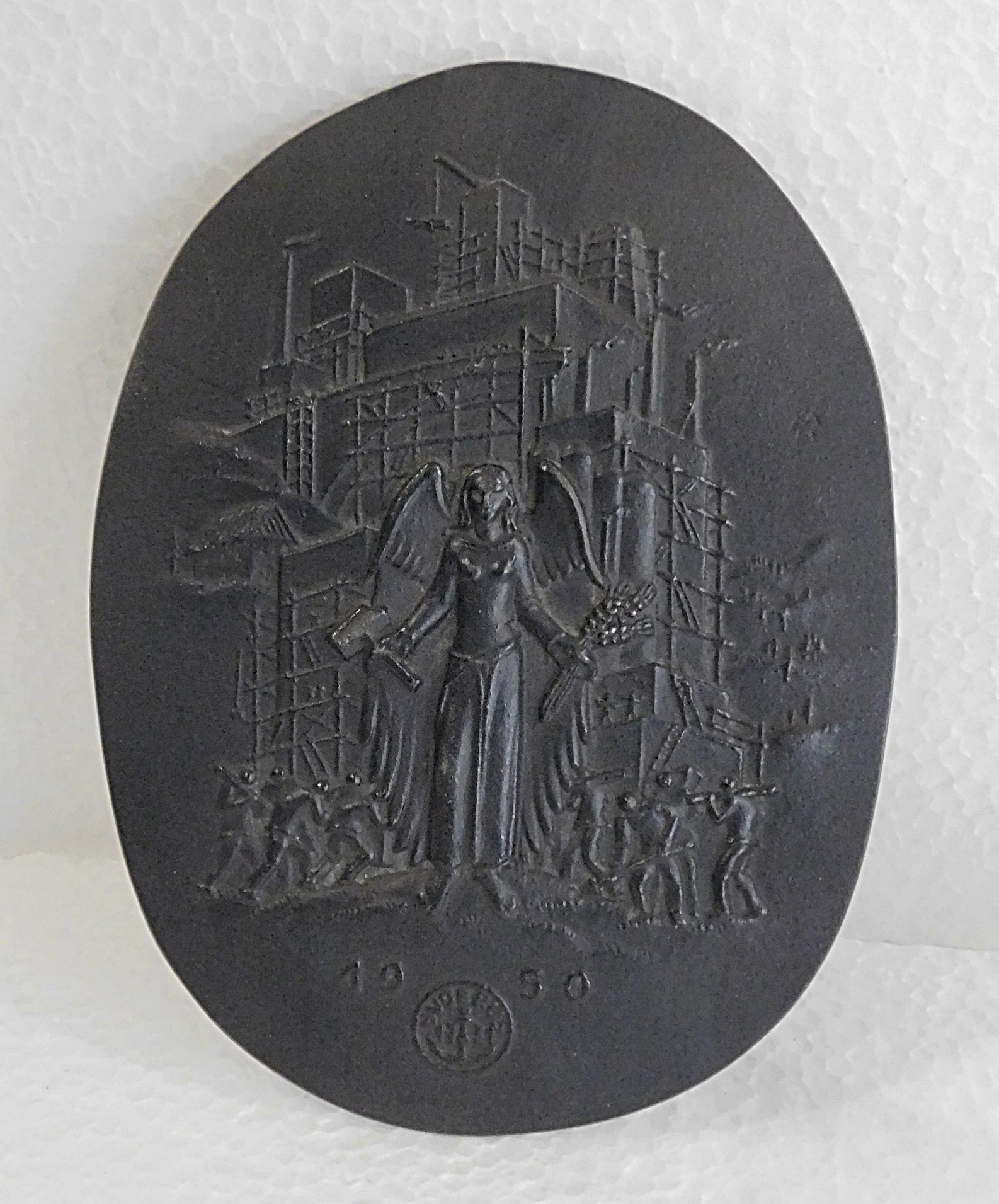 Buderus Eisenguss Relief Welt der Arbeit 1950, Entwurf Heinrich Moshage, leicht reliefiert ausgeformt, oval ca. 14,5 x 10,8 cm, Gewicht ca. 233 Gramm, bis auf leichte Gebrauchsspuren guter Zustand.
