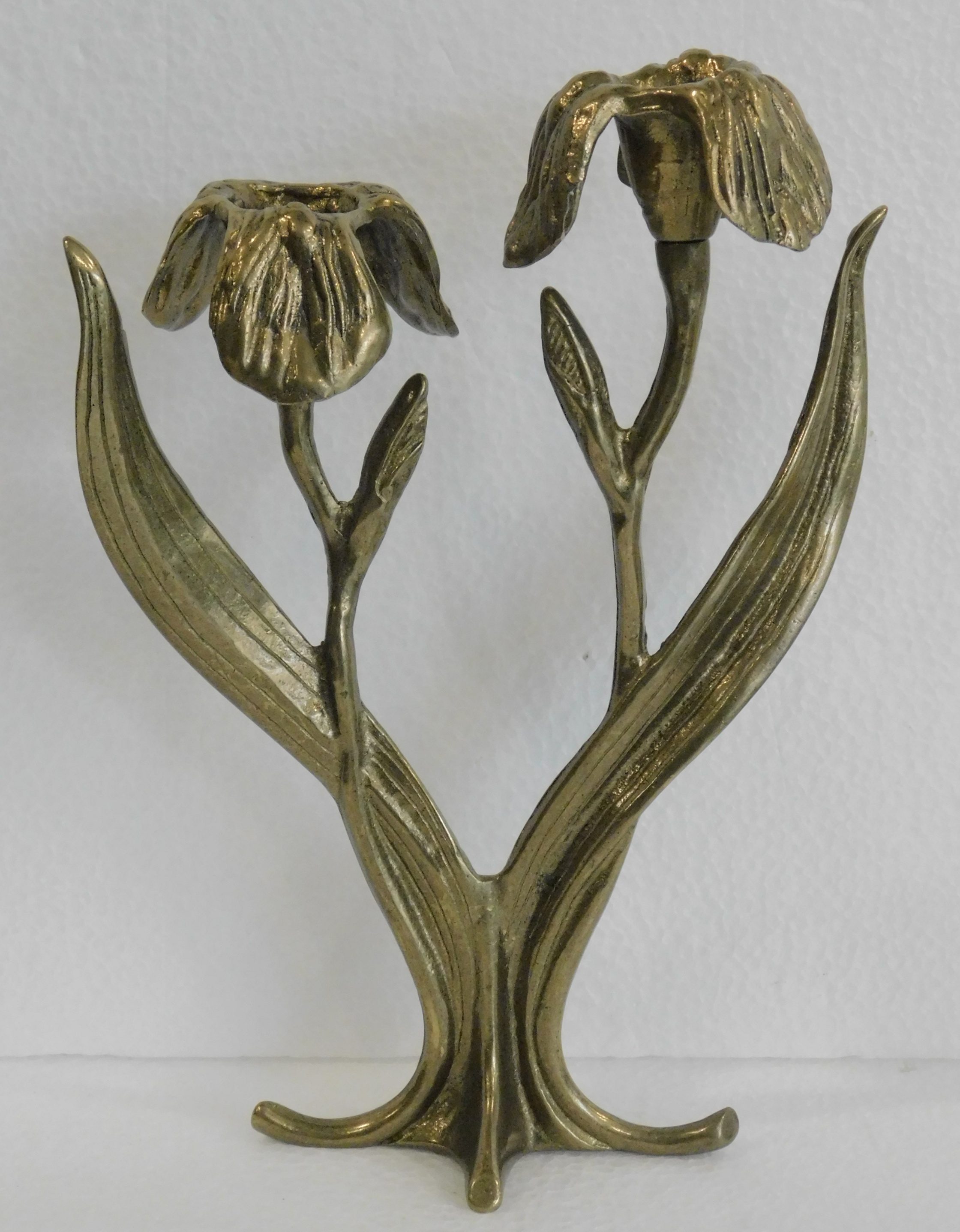 Ausgefallener 2armiger Kerzenleuchter, Messing, Blüten und Blätter Form, etwas angelaufen, bis auf leichte Gebrauchsspuren guter Zustand, Breite ca. 17,5cm, Höhe ca. 25,5 cm, Ø Öffnung für Kerzen oben ca. 2,5 cm (nach innen etwas schmaler werdend), Gewicht ca. 978 Gramm.