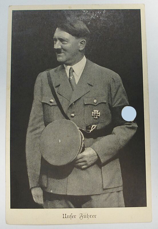 Alte Postkarte Adolf Hitler – Unser Führer , Stempel Wien 1938, rückseitig mit Bleistift beschriftet u. fleckig, Ecken leicht bestoßen u leicht geknickt, altersbedingter gebrauchter Zustand. Verkauf als historisches Zeitobjekt!