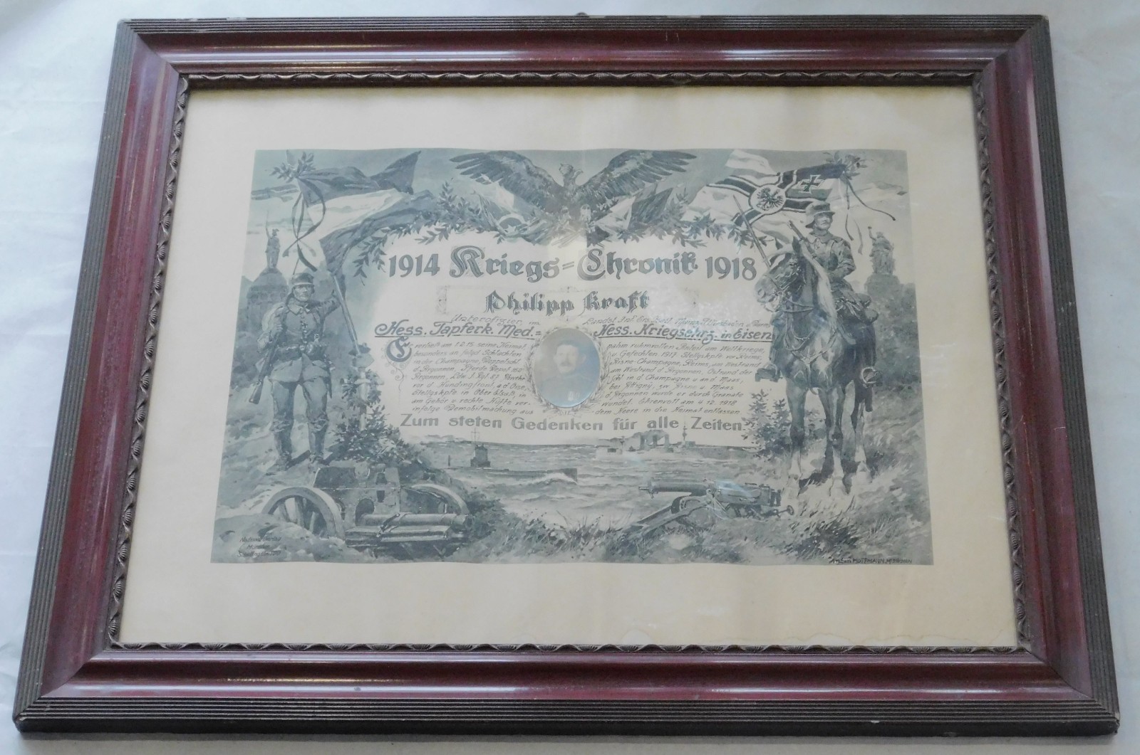 Altes Reservisten Bild: 1914 Kriegschronik 1918 – Unteroffizier im Landst. Inf. Ers. Batl. Mainz-Wiesbaden u. Darmstadt, Hessische Tapferkeits Medaille – Hessisches Kriegsehrenzeichen in Eisen, altersbedingte Gebrauchsspuren, Blatt unten mit Wasserflecken, Rahmen u. Glas als kostenlose Beigabe, Außenmaße ca. 58,7 x 49 cm.