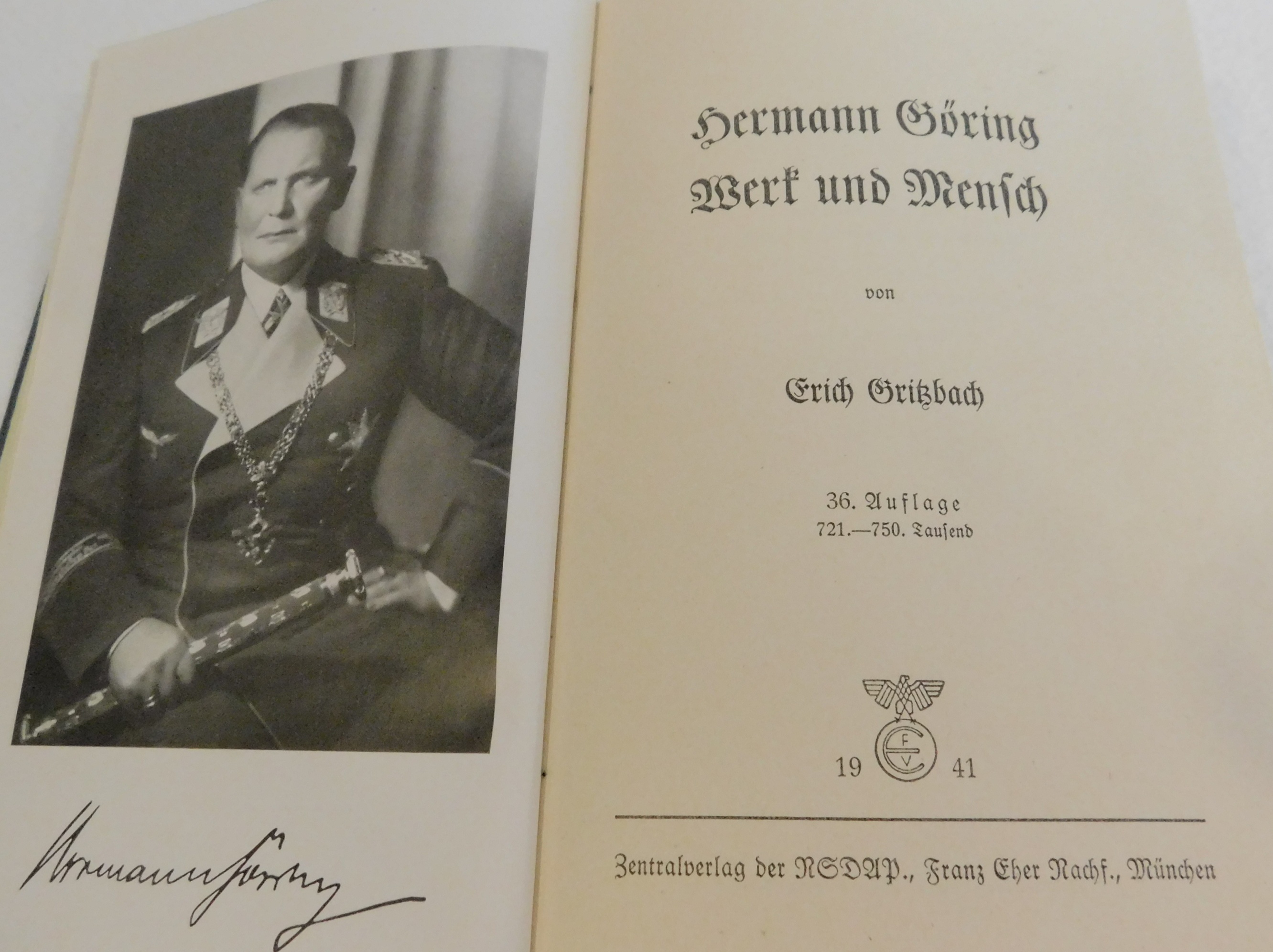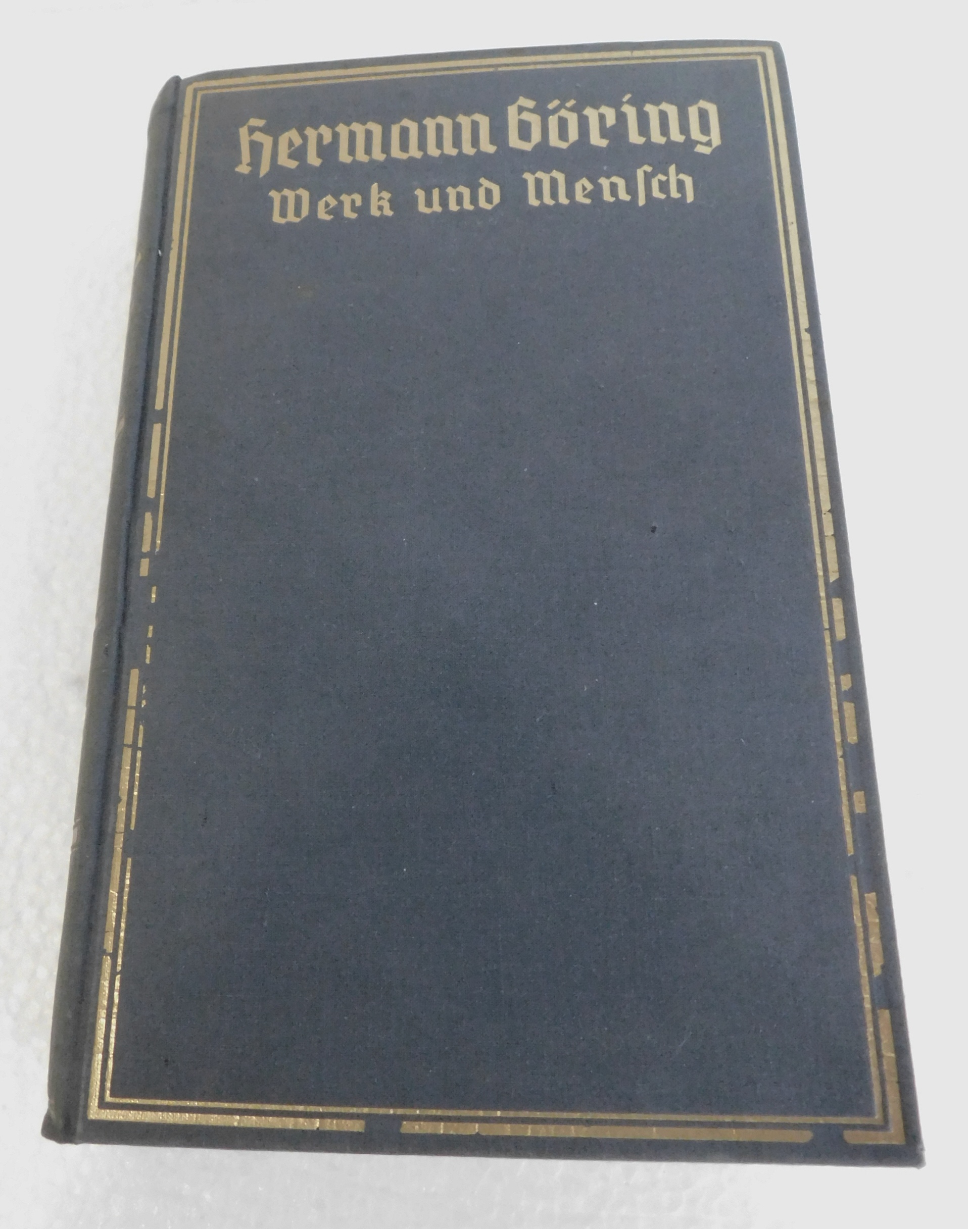 Hermann Göring – Werk und Mensch, von Erich Fritzbach, von 1941, eingeschrieben: Weihnachten 1941 und Stempel Reserve Lazarett Gmunden, Einband etwas berieben bestoßen verblichen, Seiten leicht gebräunt, ein paar kleine Fleckchen, altersbedingter gebrauchter Zustand.
