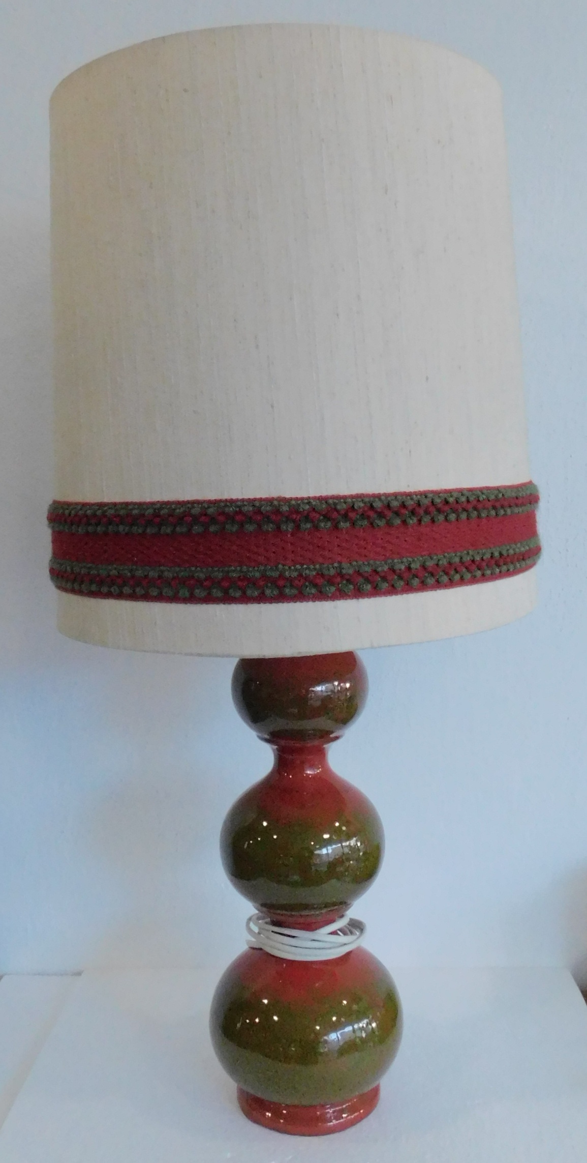 Große Vintage Keramik Tischlampe / Stehlampe, 3 „Bubbles“ in rot-grün mit passendem Stoffschirm, Kaiser Leuchten 08741, Keramikkörper wohl Jasba, in original Zustand belassen, Stoffschirm leicht verschmutzt, bis auf leichte Gebrauchsspuren guter Zustand, funktionsfähig, Ø untere Kugel ca. 14 cm, Höhe mit Schirm wie abgebildet ca. 80 cm.