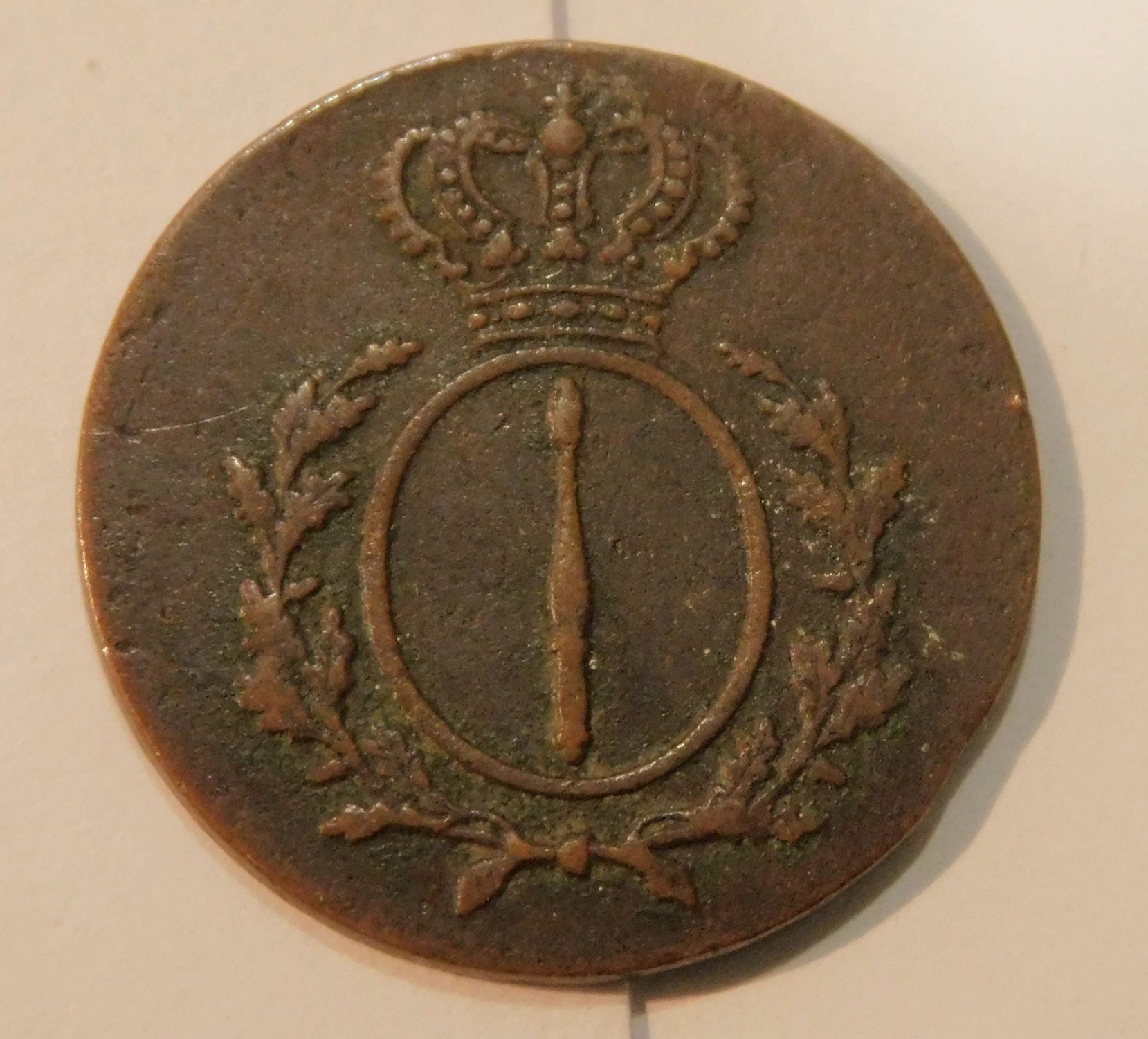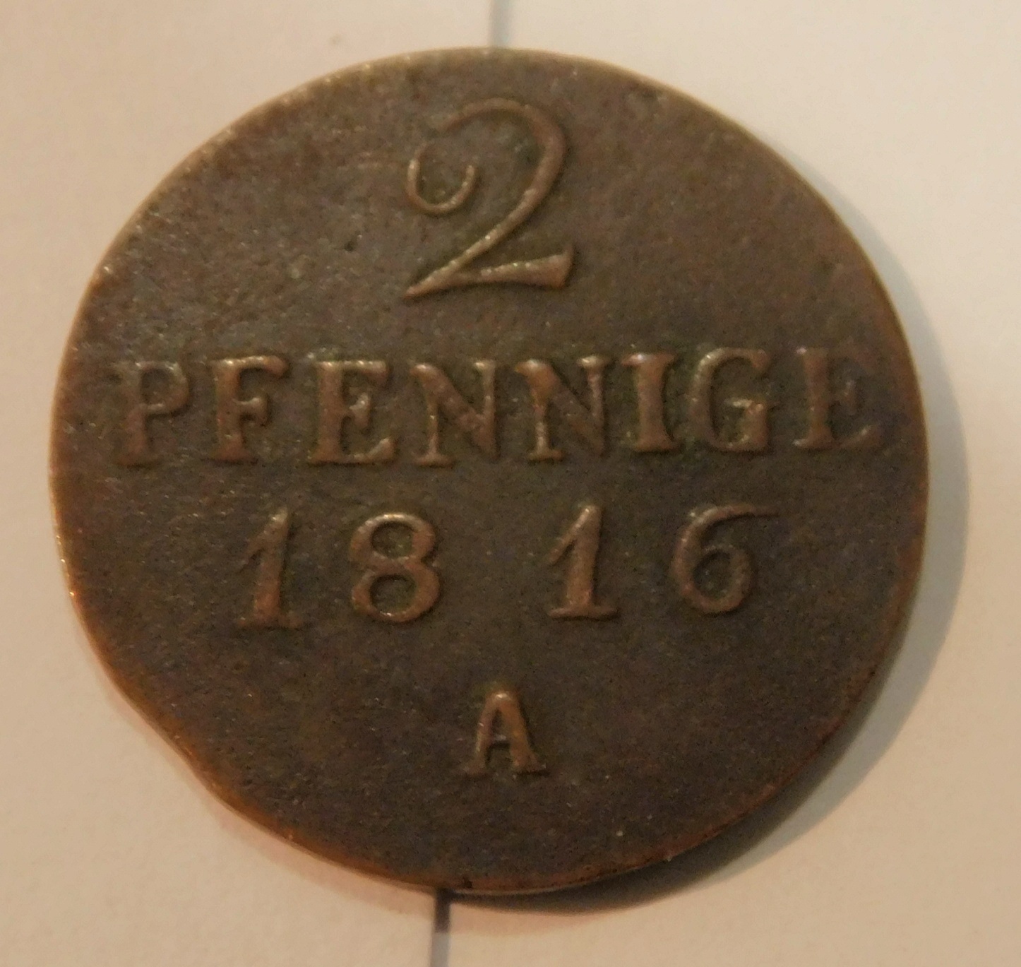 Alte Münze: 2 Pfennige 1816 A, etwas angelaufen, Randfehler, altersbedingte Gebrauchsspuren, Ø ca. 2,2 cm, Gewicht ca. 3,2 Gramm.