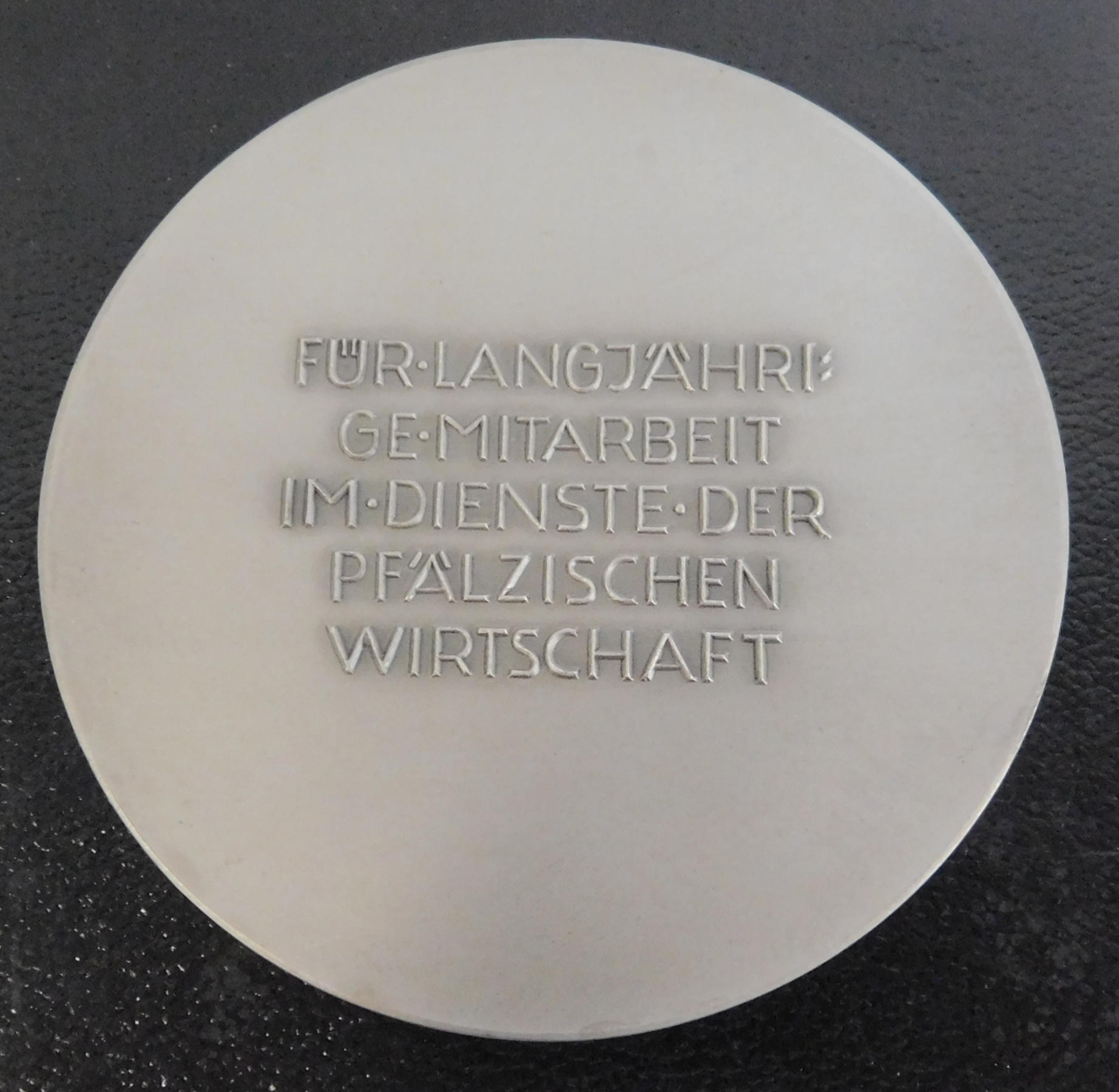 Plakette / Medaille, Entwurf Heinrich Moshage, Für langjährige Mitarbeit im Dienste der Pfälzischen Wirtschaft, Ø ca. 8 cm, Dicke ca. 0,5 cm, Gewicht ca. 183,2 Gramm, etwas angelaufen, bis auf leichte Gebrauchsspuren guter Zustand, original Kästchen mit Gebrauchsspuren - als kostenlose Beigabe, Gesamtgewicht ca. 274,2 Gramm.