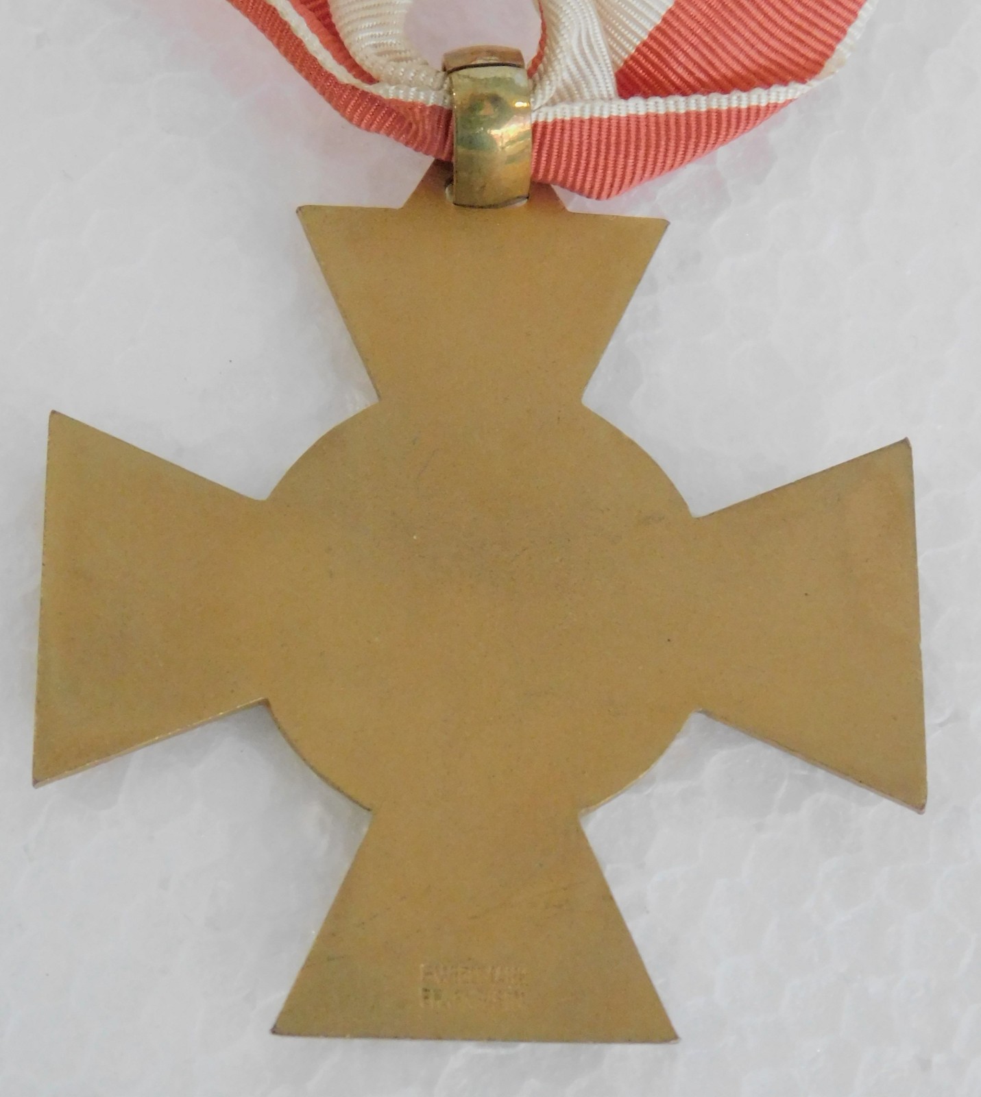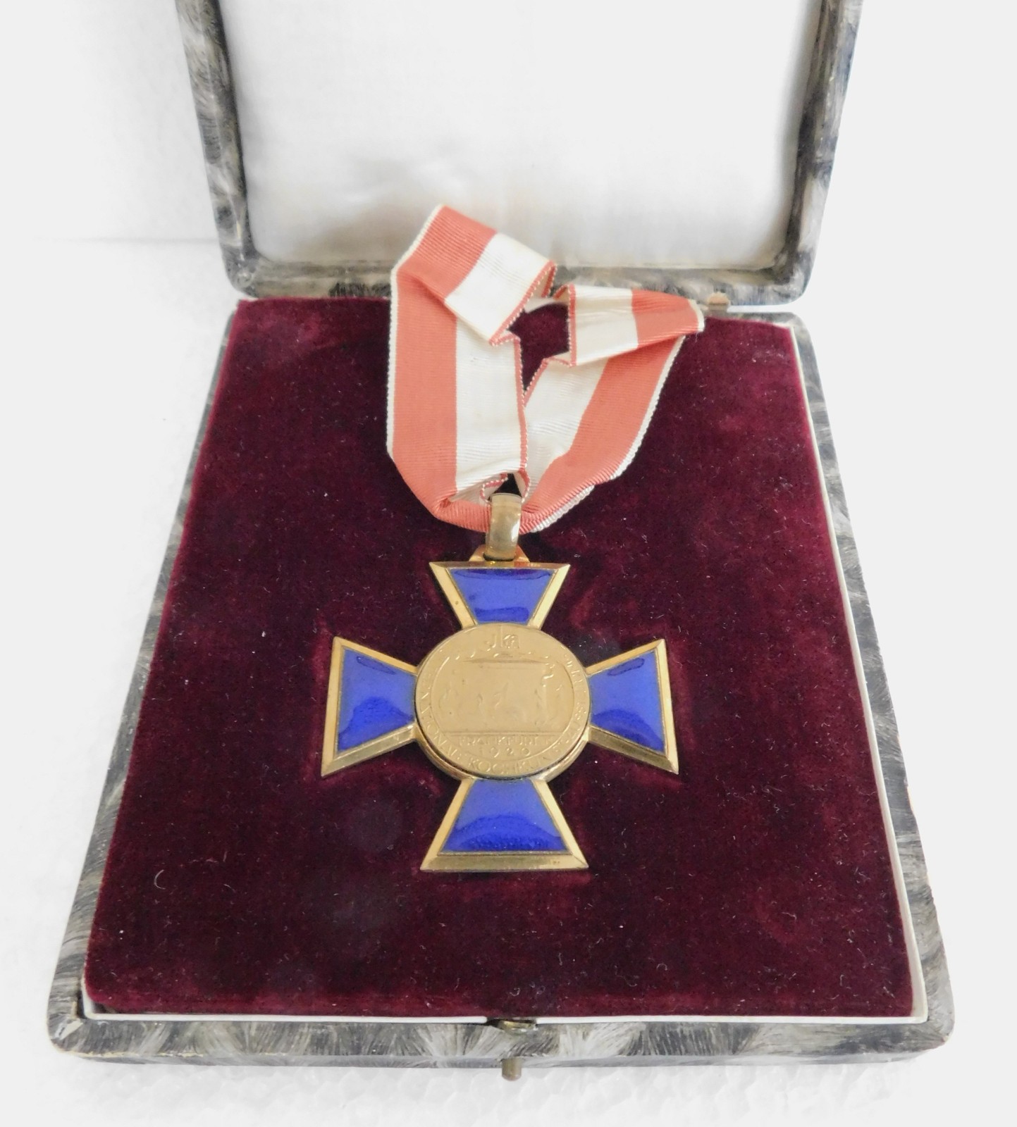 Seltene alte Medaille am Band, IKA Internationale Kochkunst-Ausstellung Frankfurt a. Main 1929, Kreuzform, goldfarben mit blauer Emaille in leicht gewölbter Ausformung, rückseitig Hersteller: F. Wiedmann Frankfurt M., guter Zustand, ca. 5,6 x 5,6 cm, Länge mit Ösen ca. 6,9 cm, Band (ob original ?) mit leichten Gebrauchsspuren, original Kästchen mit Samt und Stoff ausgeschlagen, mit Gebrauchsspuren - als kostenlose Beigabe, Papierdekor etwas abgerissen und Kanten leicht berieben, Gesamtgewicht ca. 211 Gramm.