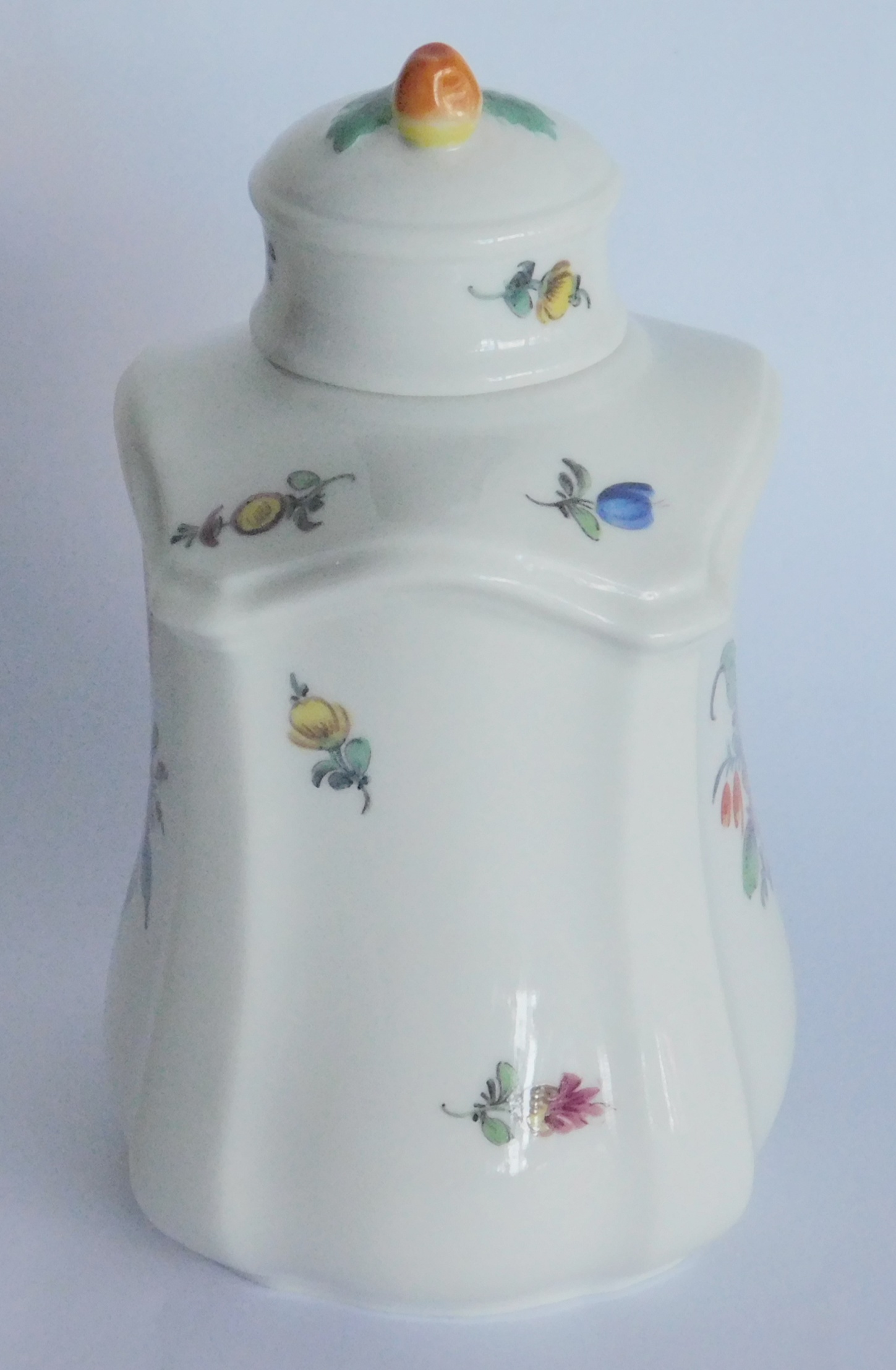 Teedose Nymphenburg, bunte Blumen, handbemalt, I. Wahl, guter Zustand, ca. 8,8 x 7,4 cm, Gesamthöhe mit Blüte auf dem Deckel ca. 12,5 cm, Gewicht ca. 228,2 Gramm.