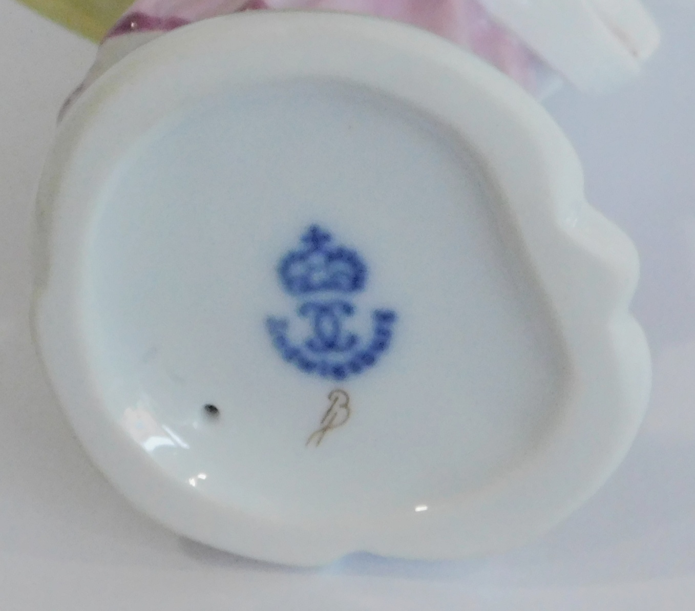 Dekorative Porzellanfigur Frau mit Bücherkorb, handbemalt, guter Zustand, Höhe ca. 15,5 cm, Gewicht ca. 173,7 Gramm.