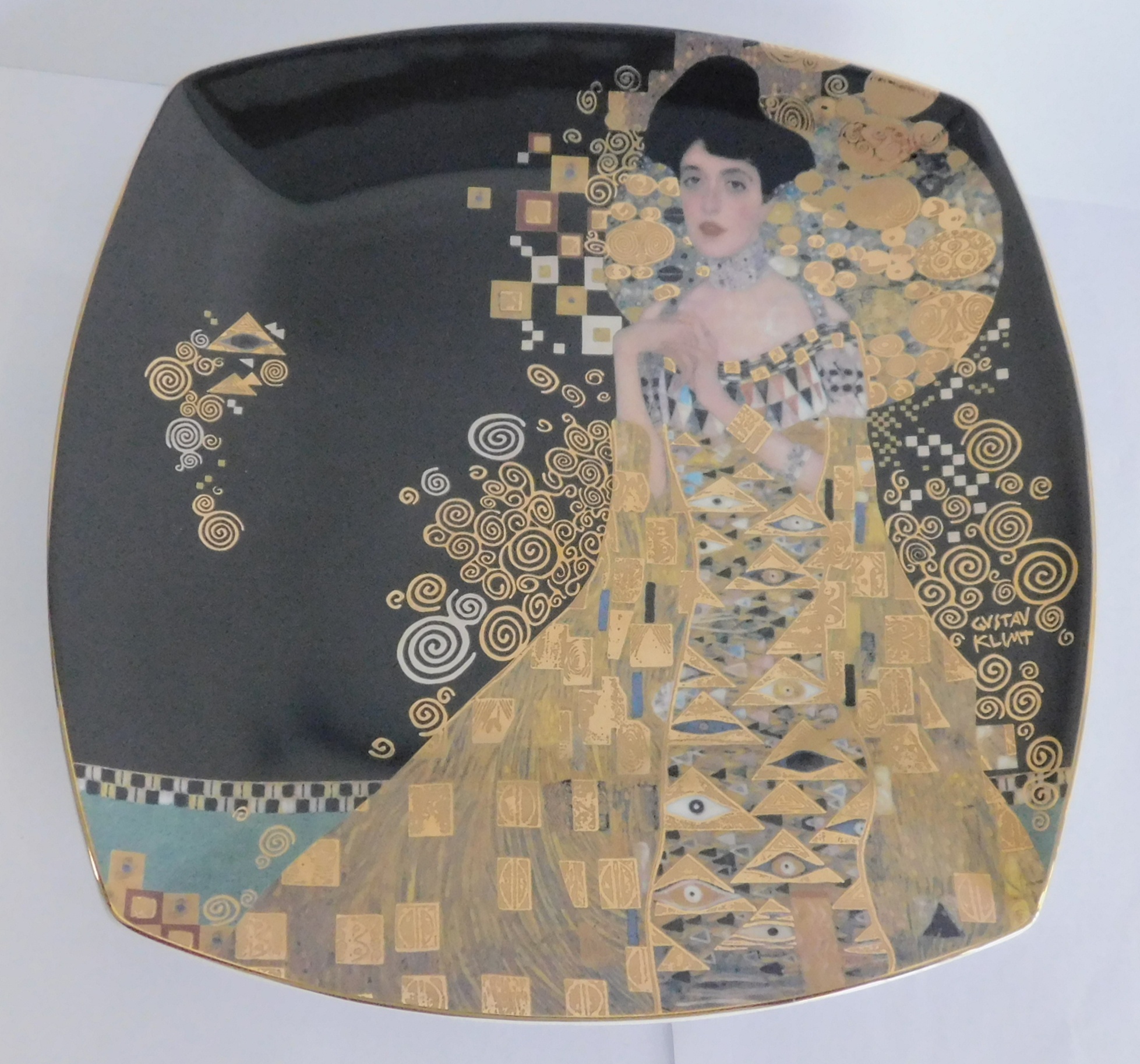 Teller von Goebel - Artis Orbis mit Motiv Adele Bloch-Bauer nach Gustav Klimt, ca. 21 x 21 cm, Randhöhe ca. 2,3 cm, Gewicht ca. 395,7 Gramm, guter Zustand.
