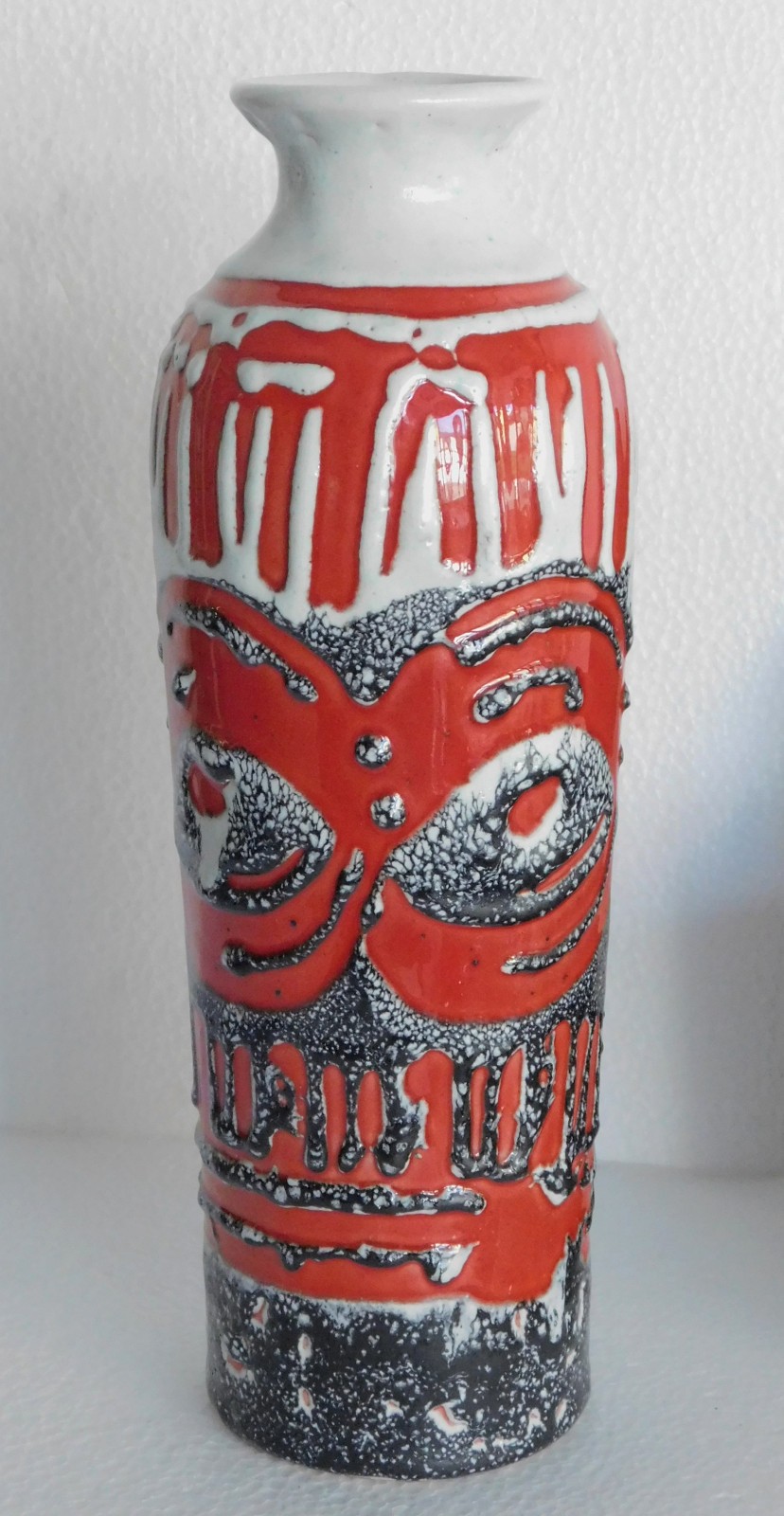 Große Keramikvase mit ausgefallener Glasur, fat lava, abstrakte Augen, könnte von Istvan Erdelyi sein ?, guter Zustand, Ø oben ca. 7 cm, Höhe ca. 31,5 cm, Gewicht ca. 846 Gramm.