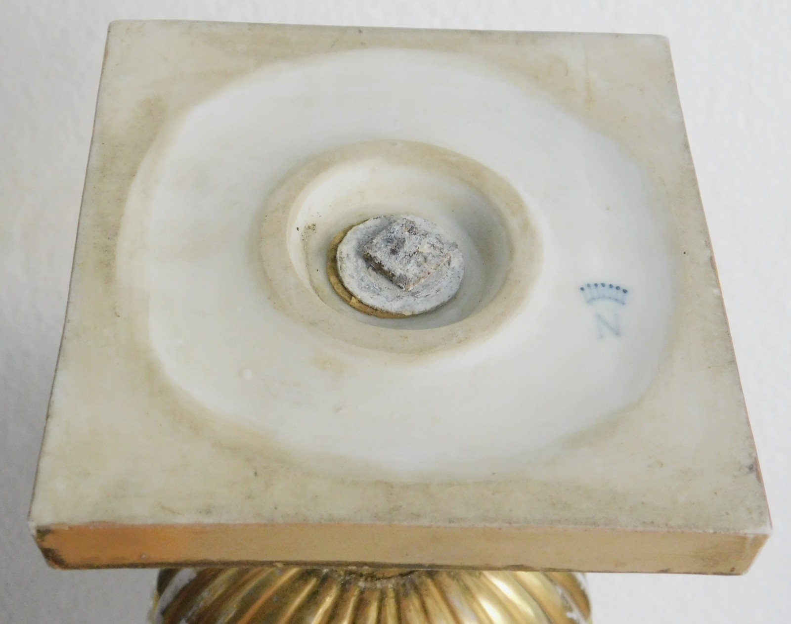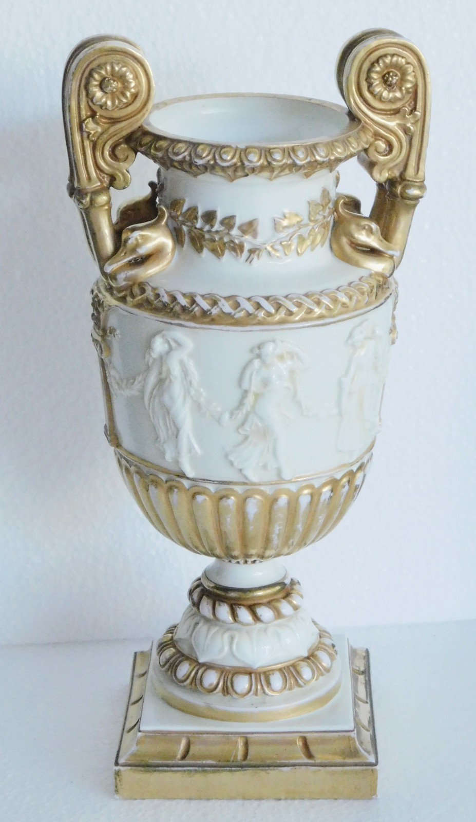 Uralte Prunkvase, umlaufendes Reliefdekor tanzender Frauen mit Blütengirlanden im antiken Stil, hochgezogene breite Griffe mit Blumenrelief die seitlich in Vogelköpfen auslaufen und nach unten hin mit griechischen Säulen und Blütenkranz fortgesetzt werden, insgesamt eine imposante Ausformung, Gold stellenweise berieben - teilweise etwas stärker, 2teilig verschraubt - Verschraubung etwas korridiert daher beweglich – wird von mir so belassen, ansonsten bis auf leichte Gebrauchsspuren guter Zustand, gemarkt N mit siebenzackiger Krone – Hersteller ? - evtl. aus dem Thüringer Raum ?, Breite oben mit Griffen ca. 13,7 cm, Ø mittig ca. 11 cm, Höhe mit Griffen ca. 29,5 cm, Gewicht ca. 1324 Gramm.