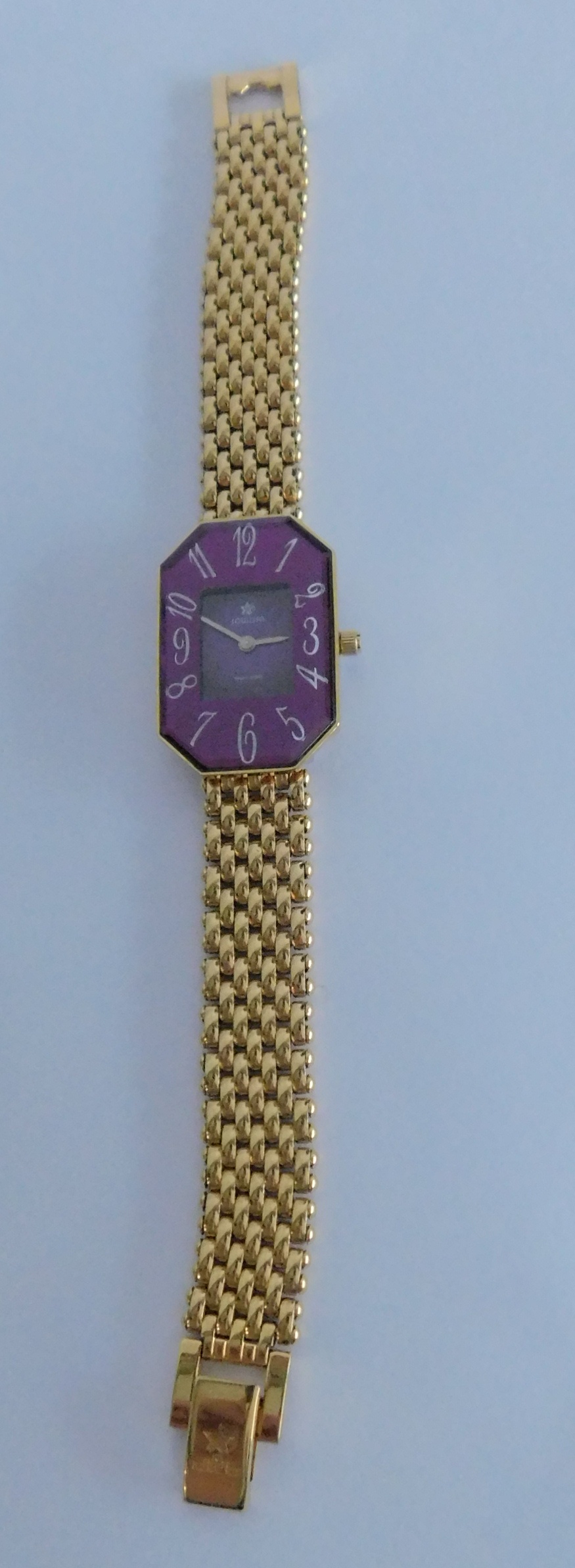 Elegante Damenarmbanduhr Jowissa Swiss Made, lilafarbenes Ziffernblatt, Edelstahl goldfarben, Quartz, guter Zustand, funktionsfähig - läuft, Gehäuse ca. 3,2 x 2,2 cm, Armband Länge ca. 14,5 cm, Gewicht ca. 32,7 Gramm.