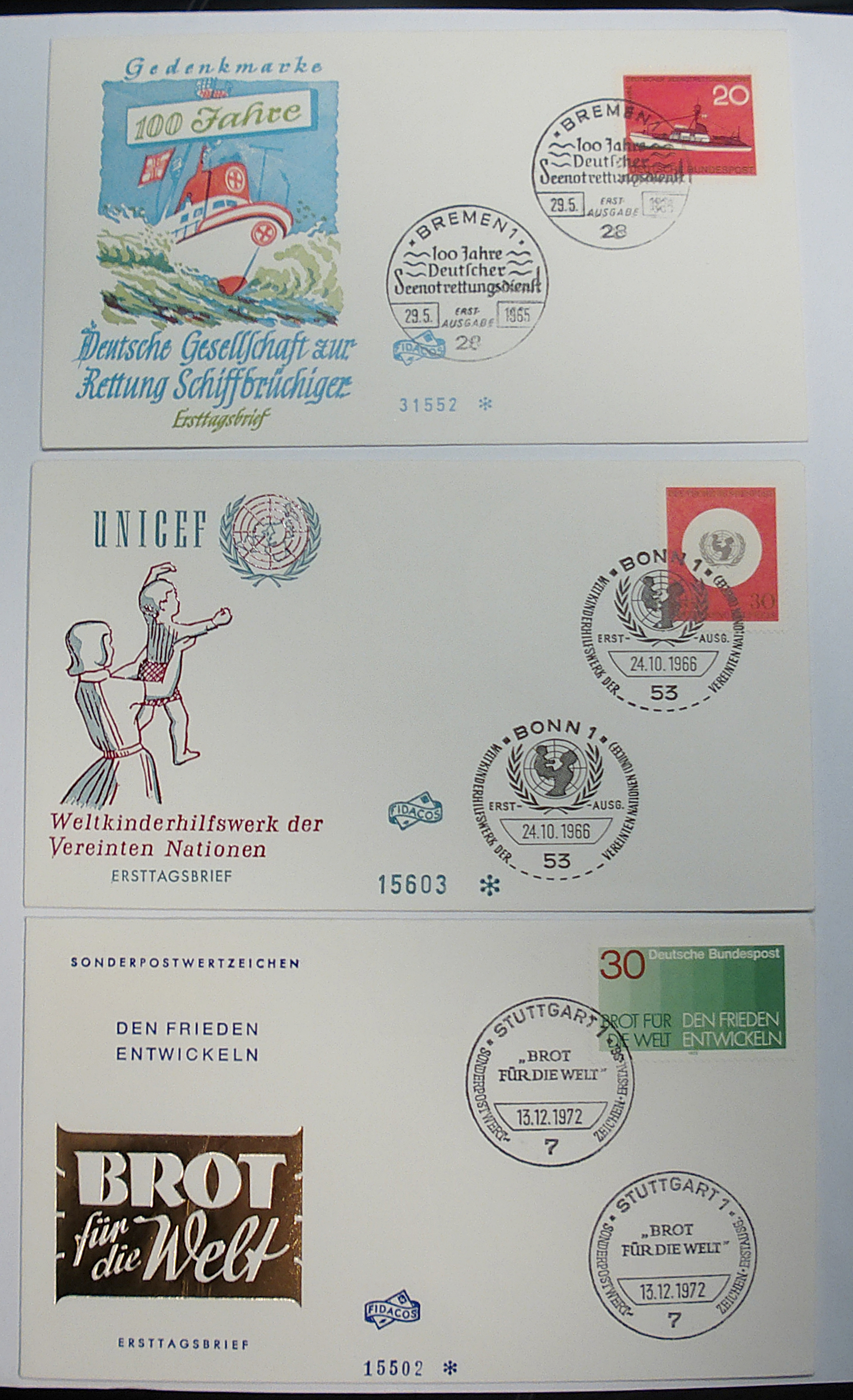 3x Ersttagsbrief Brot für die Welt Unicef DGzRS
