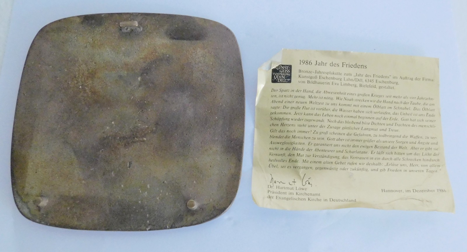 Bronze Relief, Jahresplakette zum Jahr des Friedens, Noah mit der Taube, Kunstguss Eschenburg Lahn-Dill (Herstellerprägung s. Foto), Entwurf Eva Limberg (signiert L - s. Foto), schön reliefiert ausgeformt, beiliegender original Zettel mit Beschreibungstext (war ursprünglich aufgeklebt), ca. 14 x 14 cm, Gewicht ca. 551 Gramm, leichte Patina, guter Zustand.