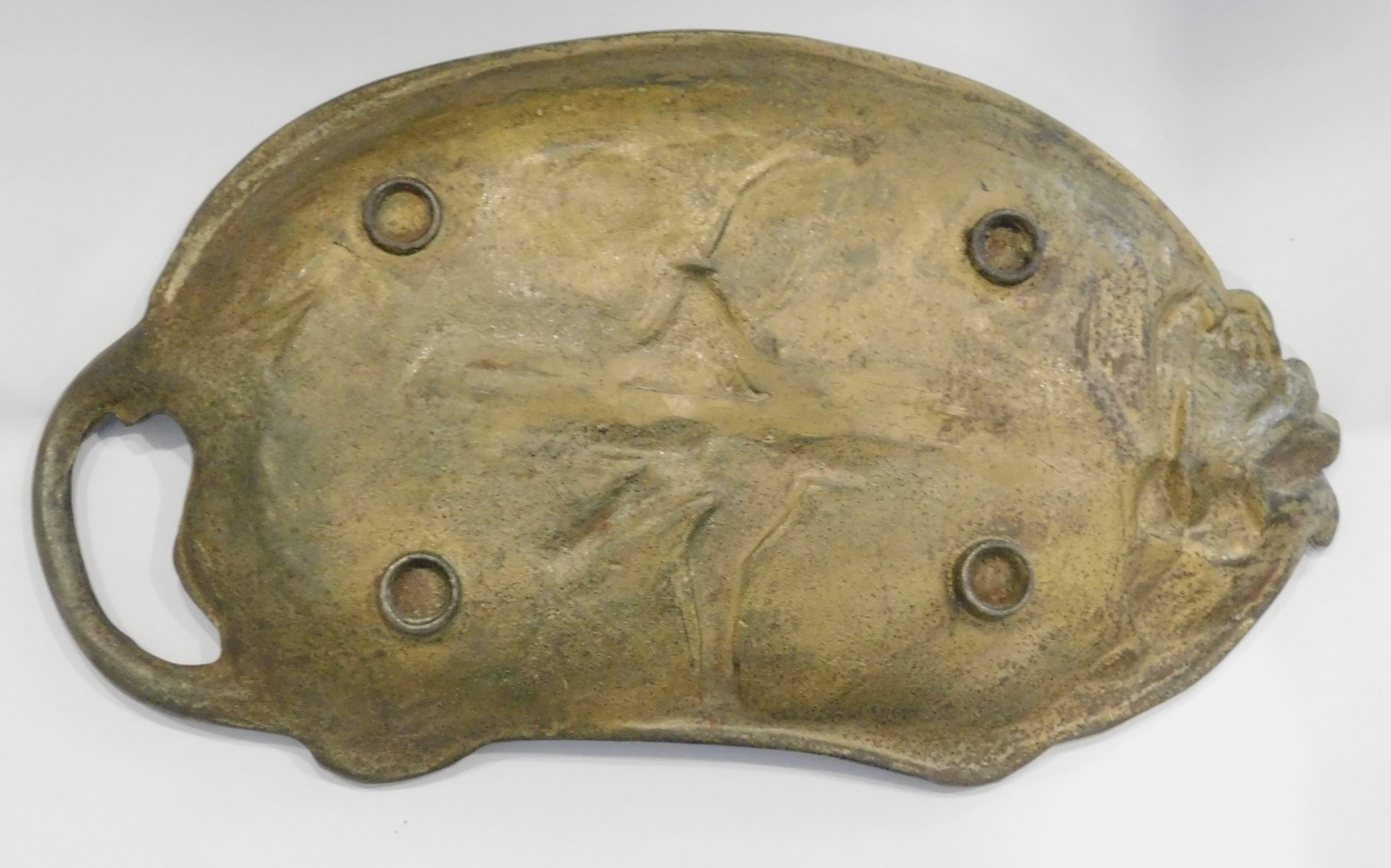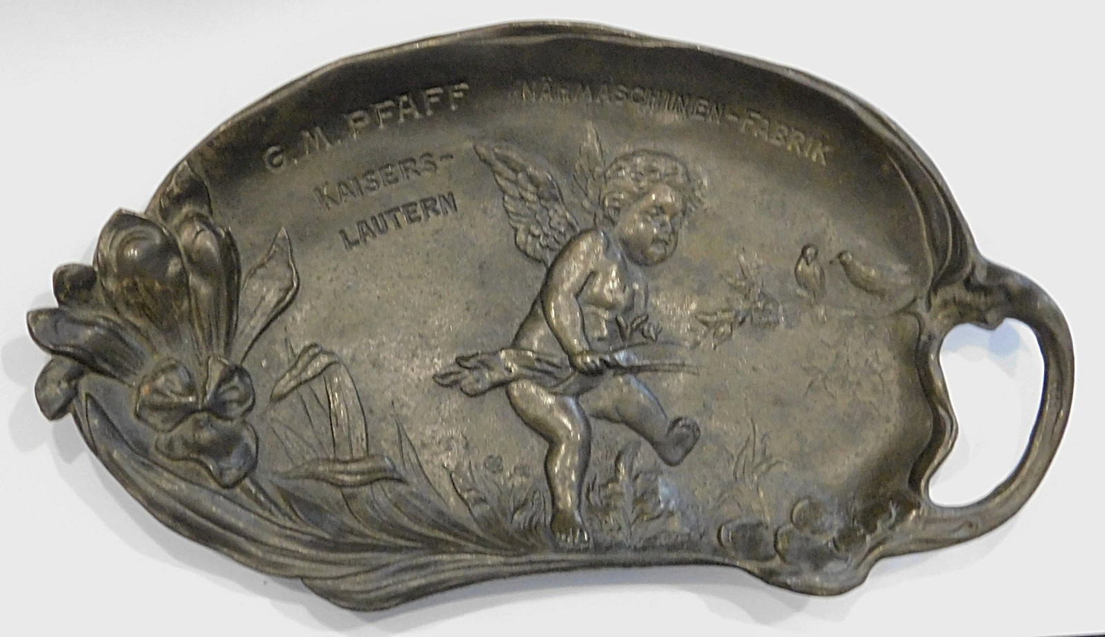 Seltene alte flache Schale / Tablett mit Prägung G. M. Pfaff Nähmaschinen-Fabrik Kaiserslautern, Jugendstil um 1900, schön ausgeprägtes florales Motiv mit nacktem Putto / Engel und Vögeln, Eisenguss, oberseitig etwas angelaufen, anhand der Unterseite vielleicht bronziert oder vergoldet gewesen, in original Fundzustand belassen, ca. 23,5 x 13 cm, Randhöhe ca. 1,5 – 2,5 cm, Gewicht ca. 491 Gramm.